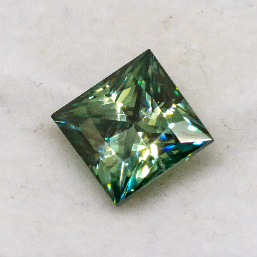 5.5 ct Vivid Blue Green Moissanite in a Princess cut